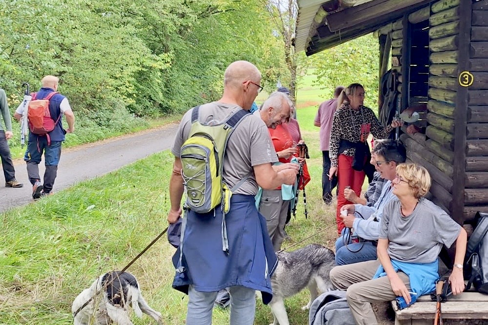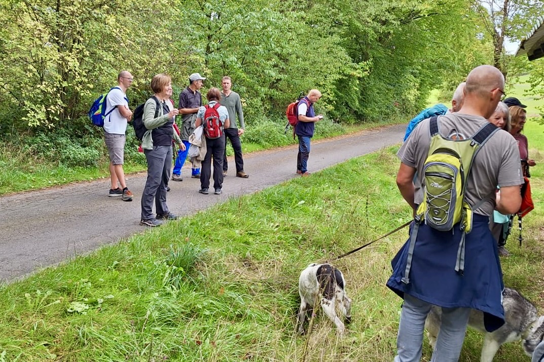 Trotz grauer Wolken und gelegentlicher Regentropfen ließen sich unsere wanderfreudigen DGG-Mitglieder nicht die Stimmung verderben! Fröhlich ging es auf die rund 7,5 Kilometer lange Strecke von Vielbrunn in Richtung Gasthaus „Zur Post“ nach Momart.